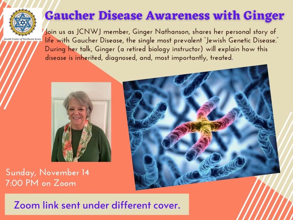 Join us as JCNWJ memeber, Ginger Nathanson, shares her personal story of life with Gaucher Disease, the singal most prevalent "Jewish Genetic Disease."During her talk, Ginger (a retired biology instructor) will explain how this disease is inherited, diagnosed , and most importantaly treated.