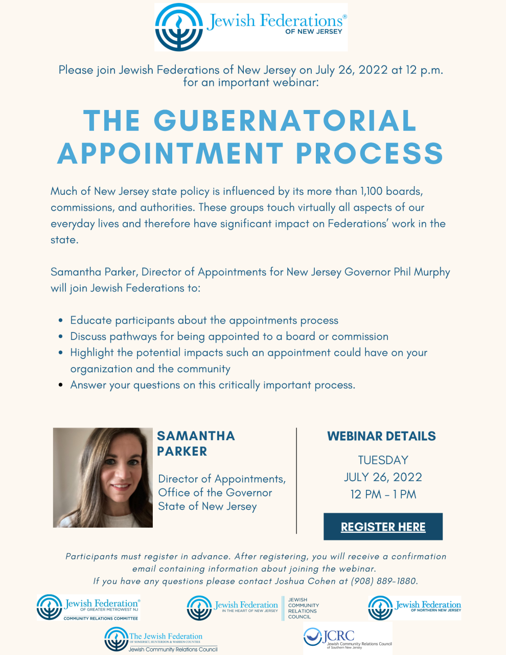 Please join Jewish Federations of New Jersey on Tuesday, July 26, 12pm - 1 pm to learn about New Jersey’s appointments process from Samantha Parker, Director of Appointments for Governor Murphy.