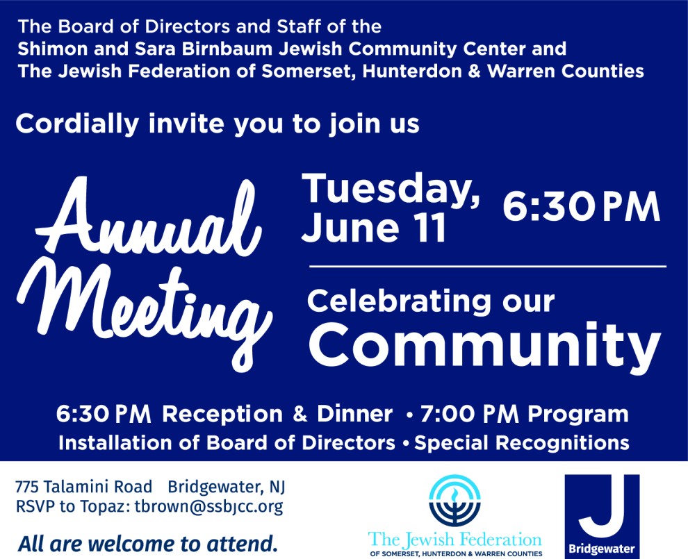 Join the Board and Staff of both The Shimon and Sara Birnbaum Jewish Community Center and The Jewish Federation of Somerset, Hunterdon and Warren Counties for their Annual Meeting!