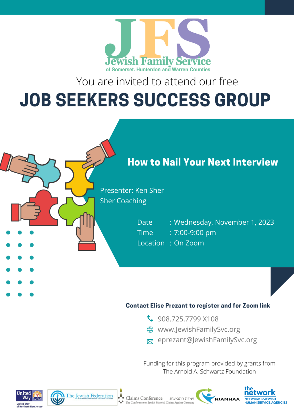 Jewish Family Service of Somerset, Hunterdon and Warren Counties is offering a Job Seekers Success Group for active job seekers who are unemployed, underemployed or seeking a career change. The next group will be held on Wednesday, November 1, 2023 from 7:00-9:00 p.m. via Zoom. The topic for this session is “How to Nail Your Next Interview” presented by Ken Sher, Sher Coaching.