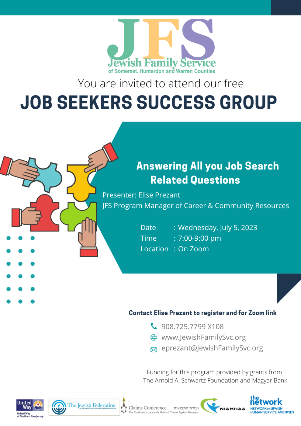Jewish Family Service of Somerset, Hunterdon and Warren Counties is offering a Job Seekers Success Group for active job seekers who are unemployed, underemployed or seeking a career change. The next group will be held on Wednesday, July 5, 2023 from 7:00-9:00 p.m. via Zoom. The topic for this session is “Answering All your Job Search Related Questions” presented by Elise Prezant, JFS Program Manager of Career & Community Resources.