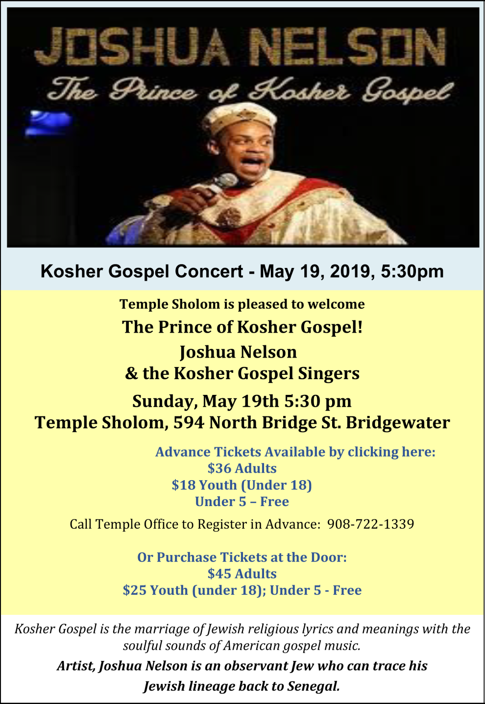 Temple Sholom is pleased to welcome The Prince of Kosher Gospel!