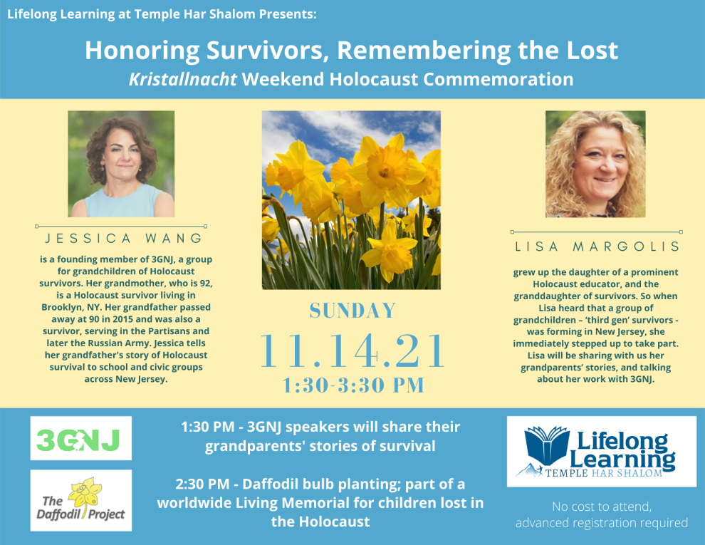The Commemoration is taking place at Temple Har Shalom (Warren, NJ) and is open to the community. The program will start at 1:30 PM with two 3GNJ speakers, Jessica Wang and Lisa Margolis, sharing their grandparents stories of survival. Weather permitting, the program will move outdoors at 2:30 PM with a daffodil bulb planting as part of the worldwide Living Memorail for children lost in the Holocaust. If you have any questions, please contact Lynn Anne Cutler, Director of Congregational Learning at Temple Har Shalom.