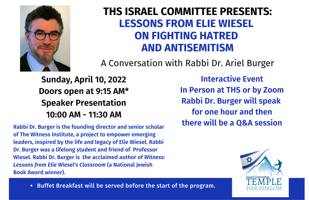 The THS Israel Committee is pleased to welcome the highly esteemed writer and speaker, Rabbi Dr. Ariel Burger to our Temple on Sunday, April 10th for an interactive event in person and via Zoom. Rabbi Dr. Ariel Burger will be joining us virtually for this thought-provoking, educational, and interactive free program. He will begin his one hour talk at 10:00 AM, and it will be followed by a Q&A session.