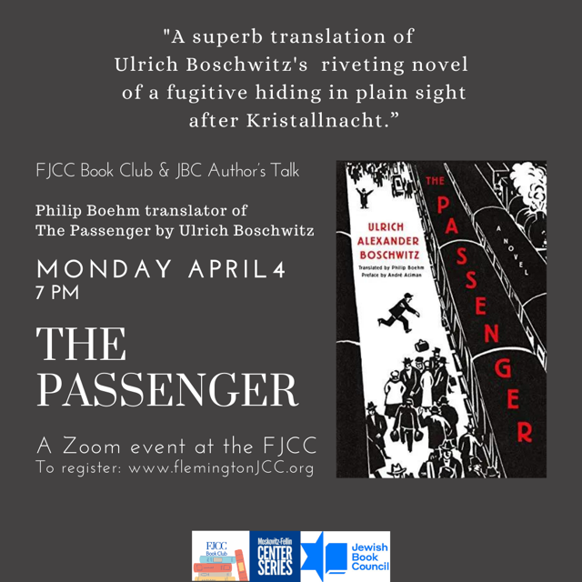 Join us at the Flemington Jewish Community Center for a Zoom Event with translator Philip Boehm as we discuss The Passenger by Ulrich Boschwitz. The Passenger is a riveting story about a fugitive hiding in plain sight after Kristallnacht. A tragic-comic story of a wealthy Jewish Berliner forced into a Hitchcockian absurdist existence.