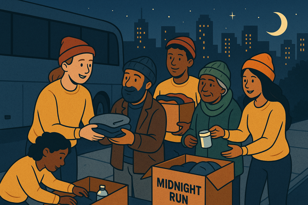Midnight Run is a nonprofit organization that coordinates more than 1,000 relief missions each year to support unhoused individuals in New York City. Volunteers from synagogues, churches, schools, and community groups work together to distribute food, warm clothing, blankets, and personal care items directly to people living on the streets.