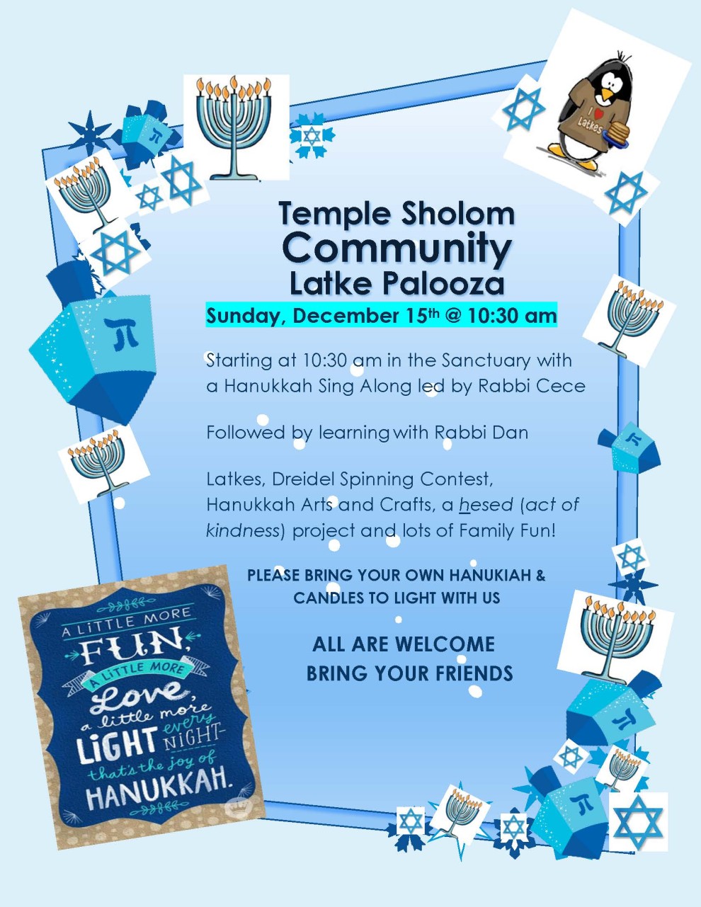 Starting at 10:30 am in the Sanctuary with a Hanukkah Sing Along led by Rabbi Cece, followed by learning with Rabbi Dan.