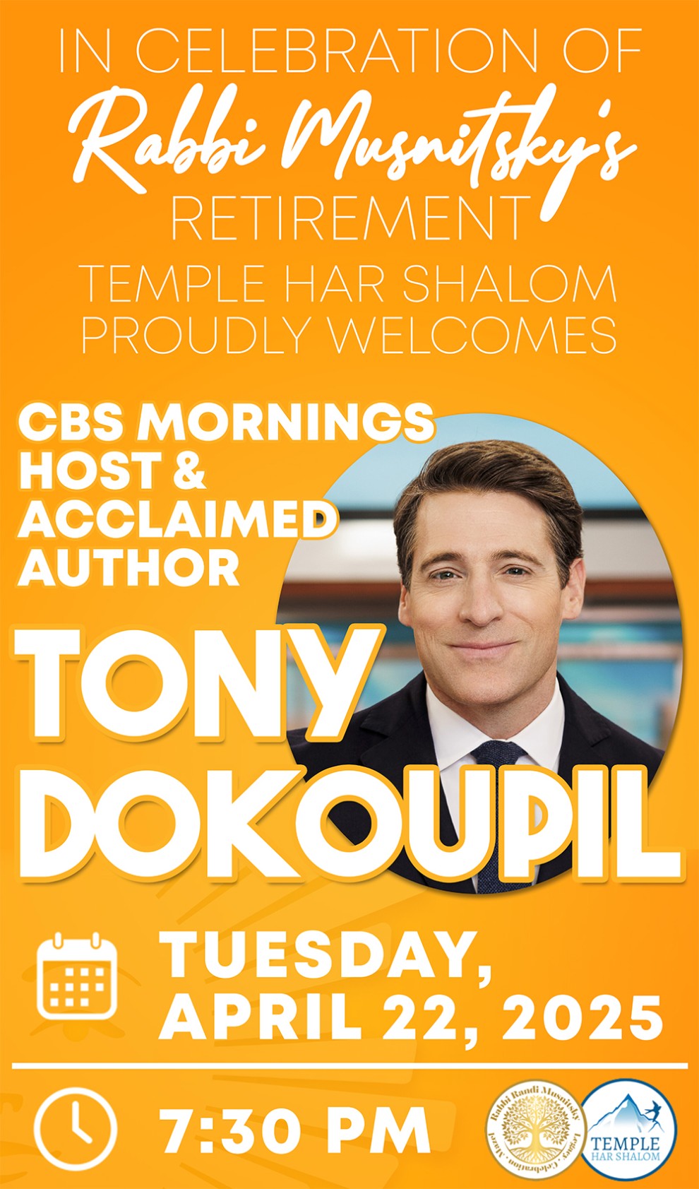 In honor of Rabbi Randi Musnitsky’s Year of Celebration, Legacy & Mazel, Temple Har Shalom is thrilled to welcome Tony Dokoupil on Tuesday, April 22, 2025.