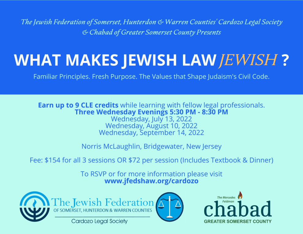 Join us for a remarkable new course from Rohr Jewish Learning Institute offered by Chabad of Greater Somerset County & The Jewish Federation of Somerset, Hunterdon & Warren Counties' Cardozo Legal Society. Earn up to 9 CLE credits while learning with fellow legal professionals.